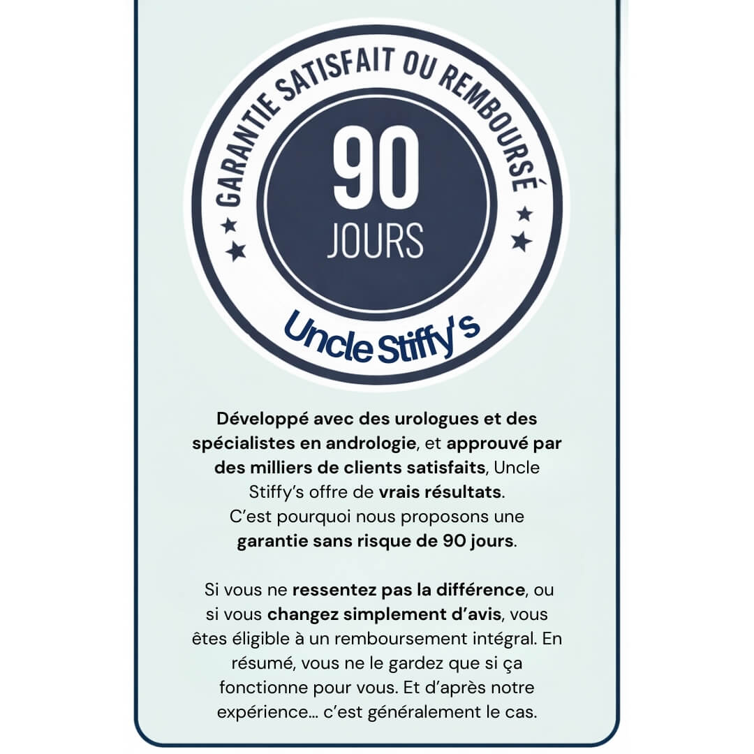 On comprend ! Surtout si vous avez déjà tout essayé sans succès. C’est exactement pour cela qu’Uncle Stiffy’s est couvert par une garantie 100% satisfait ou remboursé .